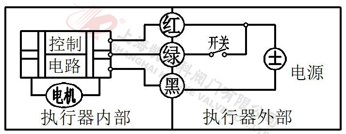 2、当绿线开关闭合,阀门关闭,到位后执行器内部自动断电。