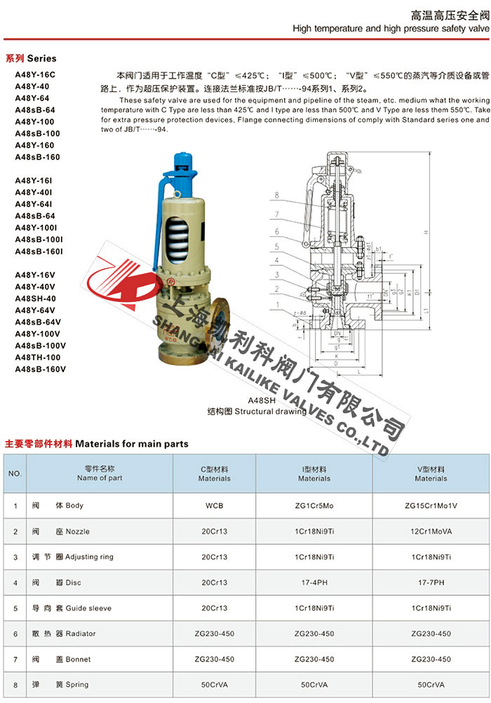 A44Y、A48Y蒸汽管道安全阀适用于工作温度≤540℃的蒸汽、空气等介质的设备或管路上。作为超压保护装置。是一种由进口静压开启的自动泄压防护装置,它是压力容器最为重要的安全附件之一。