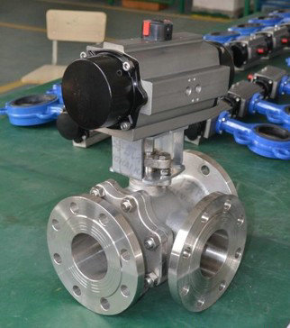 气动三通球阀分L型和T型,介质流通方向见下图。L型气动三通球阀适用于介质流向的切换,能使相互垂直的两个通道连通:T型气动三通球阀适用于介质的分流、合流或流向 切换,T型孔道可以使三个通道互相连通或使其中两个通道连通,气动三通球阀一般采用三个阀座结构,亦可根据用户要求采用四阀座结构。