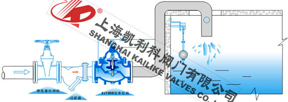 100D定水位阀是一种隔膜式调节水箱和水塔液面高度的阀门。阀门由浮球控制,当液面达到设定高度时阀门通过相关结构将信号传递给水泵,水泵停止供水;当液面低于社定位置时水泵自动启动供水。
