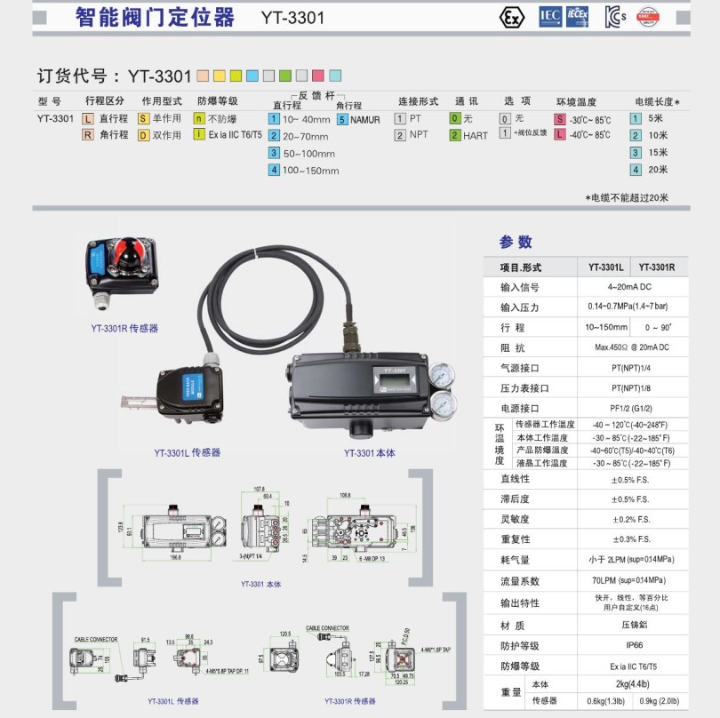 智能阀门定位器YT3301系列是通过接收控制器或控制系统发出的4~20mA 电流信号来控制阀门开关的装置。