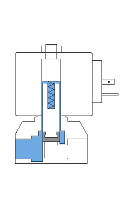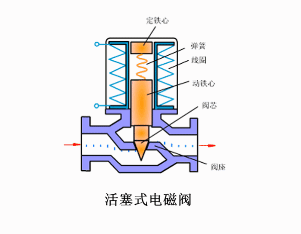 活塞式电磁阀的线圈通电后由于吸力作用,动铁芯下移,把副阀阀塞压下,副阀关闭,主阀阀杯内压力上升,当压力升到一定值时,主阀阀杯的上下压差一样,由于电磁力作用,动铁芯失去主阀阀杯下,压紧主阀阀座,阀门关闭。断电时,电磁吸力为零,副阀阀塞和支铁芯由于弹簧的作用向上提起,副阀打开,主阀阀杯上的流体经副阀流走,减少了作用在主阀阀杯上的压力,当主阀阀杯上的压力减少到一定值时,利用压差将主阀阀杯推起,主阀打开,介质流通。