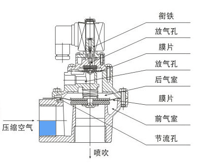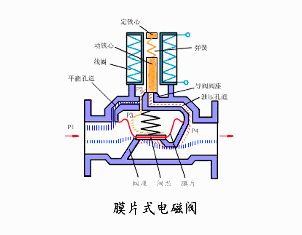 1)常闭型,通电时电磁线圈产生足够的电磁力把运动部件(由磁芯、阀杆、上下部的膜片/密封件构成)从阀座上提起,阀门开启;断电时弹簧力把运动部件压在阀座上,阀门关闭。