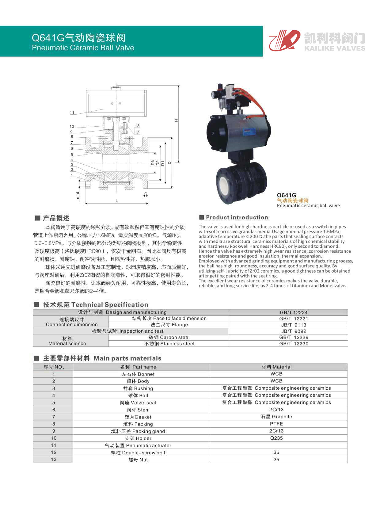 气动陶瓷球阀本阀适用于高硬度的颗粒介质,或有软颗粒但又有腐蚀性的介质管道上作启闭之用。公称压力1.6MPa,适应温度≤200℃。气源压力0.6-0.8MPa。与介质接触的部分均为结构陶瓷材料,其化学稳定性及硬度极高(洛氏硬度HRC90),仅次于金刚石。因此本阀具有极高的耐磨损、耐腐蚀、耐冲蚀性能,且隔热性好、热膨胀小。