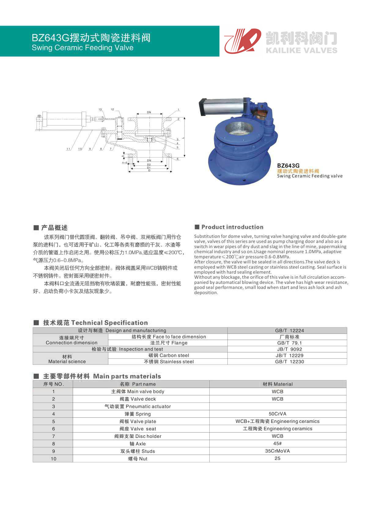 2、BZ643G摆动式陶瓷进料阀在关闭后任何方向全部密封。阀体阀盖采用WCB铸钢件或不锈钢铸件。密封面采用硬密封件。